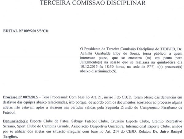 De acordo com edital da secretaria do Tribunal de Justiça Desportiva o processo que o Nacional de Patos acusa uma série de clubes de terem utilizados jogadores irregulares na Segunda Divisão do Campeonato Paraibano de 2015. A sessão que ocorrerá, nesta quinta-feira, no dia 10 de dezembro de 2015 às 18h30.
