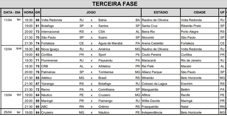 A Copa Betano do Brasil está de volta nesta terça-feira (11) com o início da terceira fase. Serão 16 confrontos nesta etapa da competição a serem decididos em partidas de ida e volta. Nesta terça, cinco jogos marcam o recomeço das decisões. O restante dos jogos de ida continua na quarta e na quinta-feira, e as partidas de volta estão previstas para os dias 25 a 27 de abril.