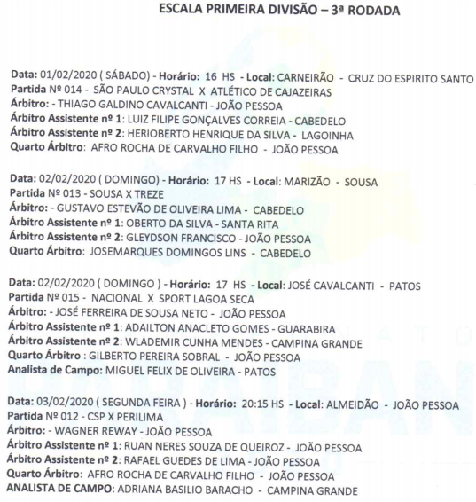 Com um jogo neste sábado, dois no domingo, um na segunda-feira e outro no próximo dia 19. Esta é a programação da terceira rodada do Campeonato Paraibano de 2020. O www.soesporte.com.br mostra todos os jogos, com locais, horários, datas e arbitragem. Sábado – São Paulo x Atlético; domingo – Sousa x Treze, Nacional de Patos x Sport Lagoa Seca; segunda-feira – CSP x Perilima; Dia 19 – Campinense x Botafogo-PB.