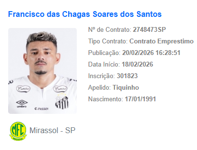 O atacante paraibano Tiquinho Soares, de 35 anos, o novo reforço do Mirassol para a temporada de 2026, já está integrado ao elenco e pronto para defender o time paulista. O nome dele foi publicado no BID da CBF nesta sexta-feira (20).