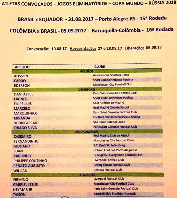 A Seleção Brasileira foi convocada para os jogos contra Equador, no dia 31 de agosto, em Porto Alegre, e diante da Colômbia, dia 5 de setembro, na cidade de Barranquilla. As partidas são válidas pelas Eliminatórias para a Copa do Mundo.