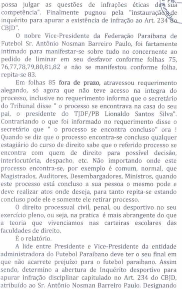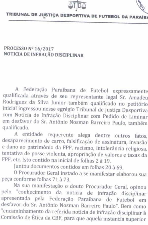 Com base em denúncias feitas pelo presidente da Federação Paraibana de Futebol, Amadeu Filho, o presidente do Tribunal de Justiça Desportiva de Futebol Lionaldo Santos determinou a abertura de inquérito, contra o vice presidente da FPF, Antonio Nosman. O relator indicado é Donato Henrique que terá 15 dias para ouvir as partes.