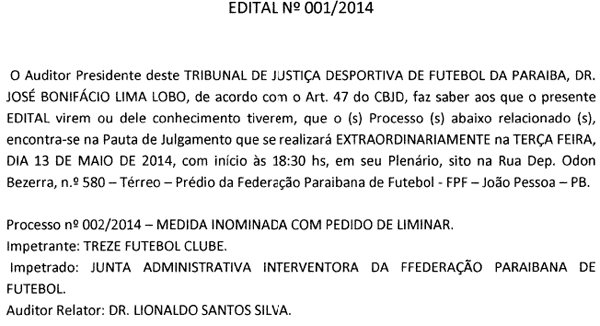 O Treze entrou com recurso no Tribunal de Justiça Desportiva da Paraíba com o objetivo de suspender a tabela do Campeonato Paraibano de 2014 modificada no decorrer da competição pela Junta Governativa.