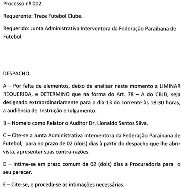 O presidente do TJD-PB, José Bonifácio Lobo determinou o julgamento para a próxima terça-feira.