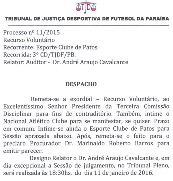 De acordo com o presidente Lionaldo Santos, o Tribunal de Justiça Desportiva de Futebol da Paraíba vai julgar o recurso do Esporte de Patos contra decisão da terceira comissão disciplinar, no próximo dia 11. O Nacional de Patos que foi beneficiado com a decisão em primeira instancia está sendo intimado para a reunião do TJDF-PB.