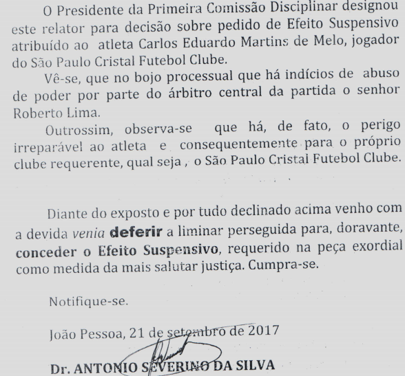 O presidente da Primeira Comissão Disciplinar do Tribunal de Justiça Desportiva de Futebol da Paraíba, Antonio Severino da Silva, liberou o zagueiro Carlão, que estava suspenso por expulsão, para defender o São Paulo da Paraíba, pelo Campeonato Paraibano da Segunda Divisão. A decisão é inédita no futebol paraibano.