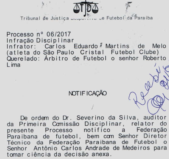 O presidente da Federação Paraibana de Futebol, Amadeu Rodrigues e o diretor técnico da FPF Antonio Carlos Baza, já foram intimado a cumprirem a determinação. Veja o documento: