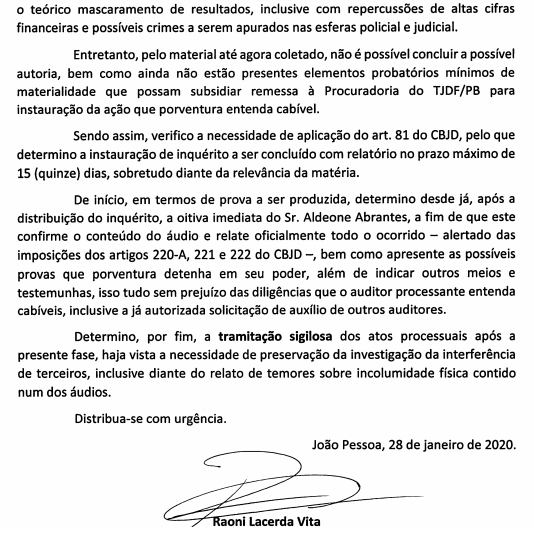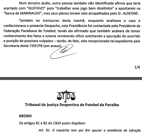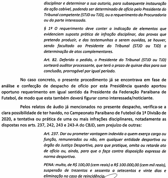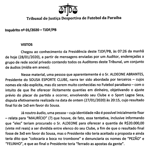 Para conhecimento dos desportistas, despacho proferido nesta terça-feira, instaurando inquérito no TJDF para apurar denúncias de manipulação de resultados no Campeonato Paraibano de Futebol, assinado pelo presidente do TJDF.