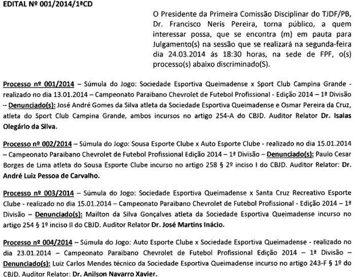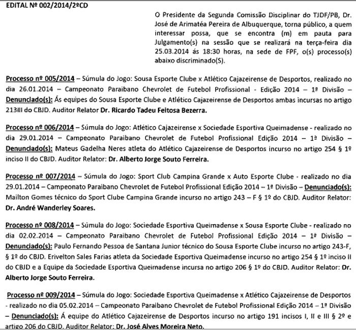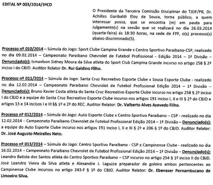 O Tribunal de Justiça Desportiva da Paraíba divulga três editais para julgamento, todos relacionados com jogos do primeiro turno do Campeonato Paraibano. A pauta tem jogadores do Auto Esporte, Sousa, Queimadense, Sport Campina, Campinense, Santa Cruz, Atlético, CSP.