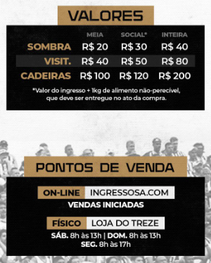 Os preços dos ingressos, para este jogo que somente os setores da Sombra e das Cadeiras estarão abertos ao público.