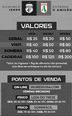 Confira o serviço de jogo para Treze x Sousa pela Série D, às 16h do próximo dia domingo (4), no estádio O Amigão. As vendas on-line já começaram (link na bio), e as vendas físicas começam nessa sexta na loja do Treze.