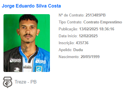 O Treze Futebol Clube informa a contratação do atacante Dudu para 2025. Jorge Eduardo Silva Costa é natural de João Pessoa e passou por clubes como Ceará, Cruzeiro, Ferroviário, Botafogo-PB, Barra-SC e Figueirense. Seu último clube foi o Capital-DF.