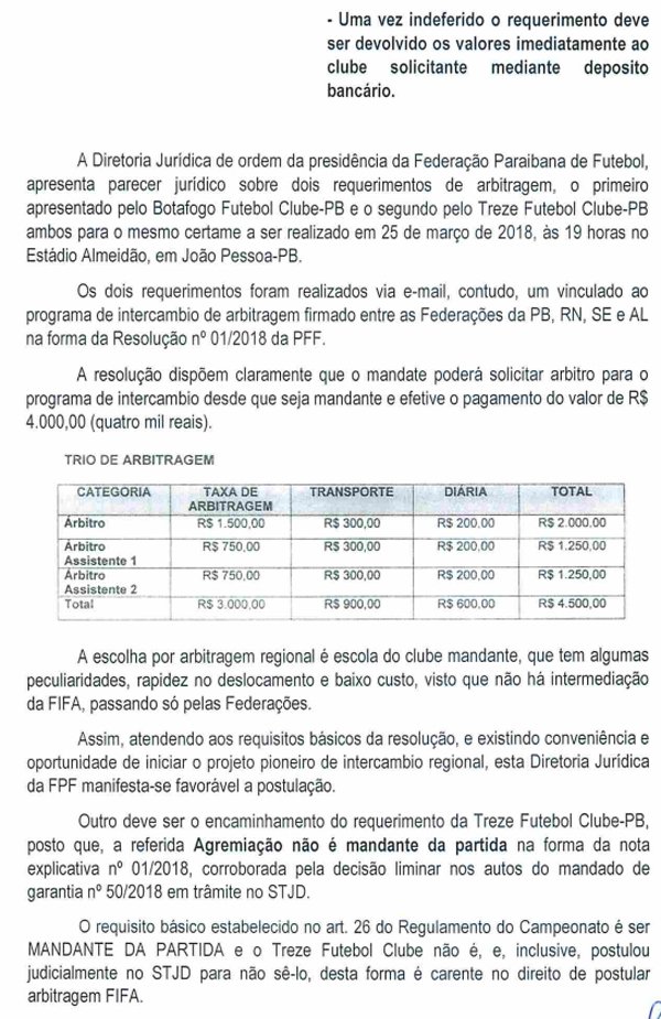 A Federação Paraibana de Futebol acabou de divulgar parecer sobre o pedido de arbitragem: