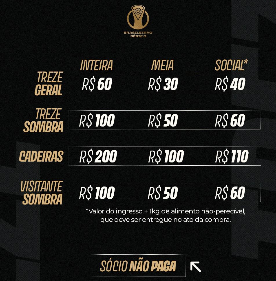 Os valores variam de acordo com o setor. Para a arquibancada geral, os ingressos custam R$60 (inteira), R$30 (meia) e R$40 (social). No setor sombra, os preços são R$100 (inteira), R$50 (meia) e R$60 (social). Já as cadeiras têm valores de R$200 (inteira), R$100 (meia) e R$110 (social). Para a torcida visitante, no setor sombra, os ingressos custam R$100 (inteira), R$50 (meia) e R$60 (social).