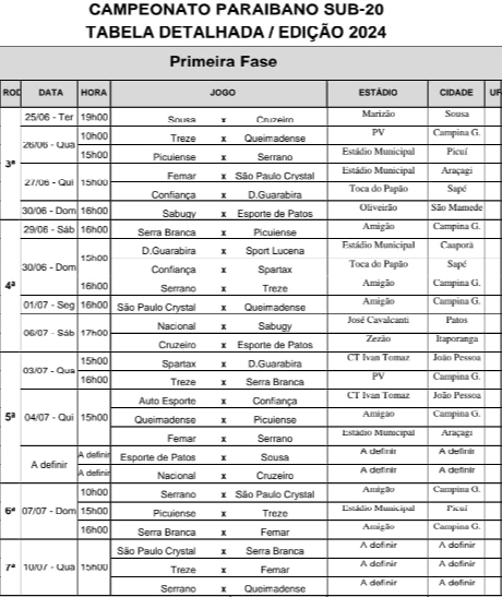 Com duas partidas nesta terça-feira (25) começa o Campeonato Paraibano Sub 20. O Treze enfrenta a Queinadense no estádio Presidente Vargas, às 10h, em Campina Grande. O Sousa recebe o Cruzeiro de Itaporanga, no estádio Marizão, às 19h, em Sousa. Veja a tabela: