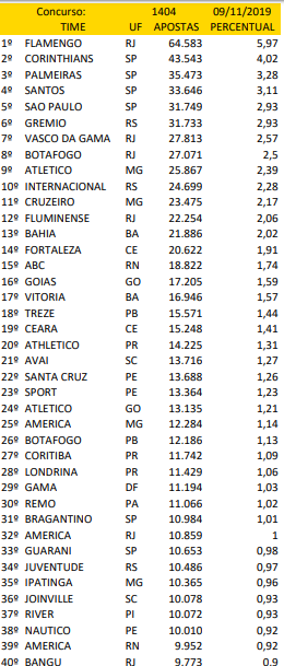 O time do Treze ainda está sendo formado para a temporada de 2020, mas sua grande torcida continua ativa e aposta no time do coração. Está semana o Treze ficou na 18a posição no concurso da timemania, mostrando que tem torcedor de verdade. Vela a lista com os 80 que são apostados em todo Brasil.