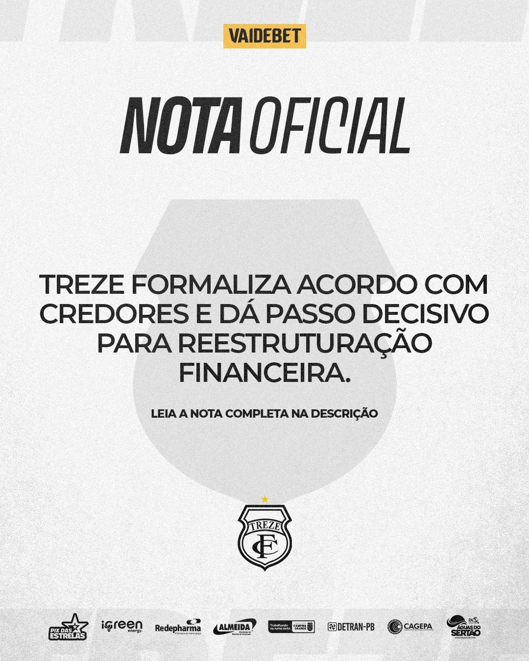 “Esse acordo mostra maturidade e compromisso com o Treze. Construímos uma solução responsável, de forma conjunta, que respeita nossa realidade financeira e, ao mesmo tempo, garante segurança aos credores. Esse é o resultado de um trabalho alinhado entre as áreas financeira, jurídica e institucional do clube.”