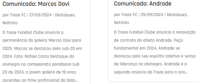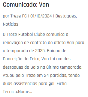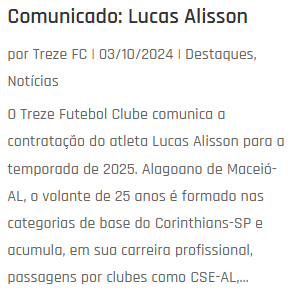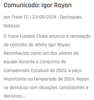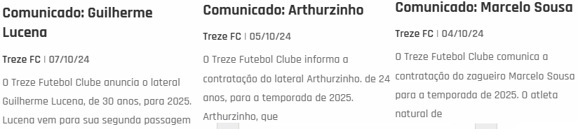 O Treze Futebol Clube anuncia o lateral Guilherme Lucena, de 30 anos, para 2025. Lucena vem para sua segunda passagem no Treze e possui passagens por clubes como Náutico-PE, Sampaio Correia-MA, Rio Claro-SP, Cianorte-PR, Salgueiro-PE, Brasiliense-DF, Manaus-AM, entre outros. Seu último clube foi o Atlético-PI.