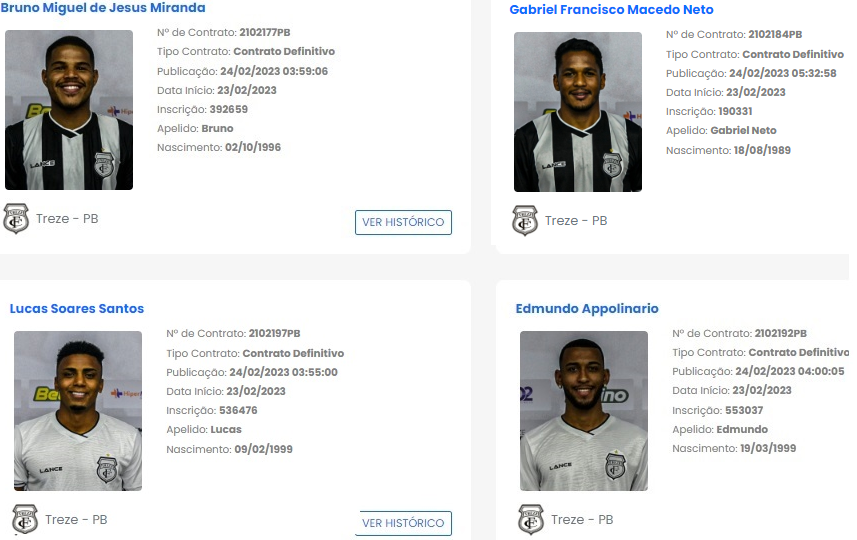 Os quatro jogadores anunciados pela diretoria do Treze, esta semana já estão regularizado e poderão atuar na partida de domingo (26.2.23), no clássico contra o Campinense. Os nomes de Bruno, Gabriel Neto, Lucas e Edmundo foram publicados nesta sexta-feira (24.2.23).