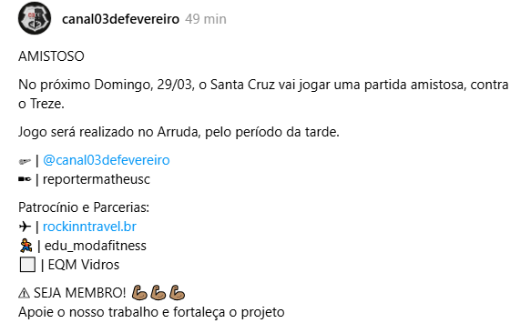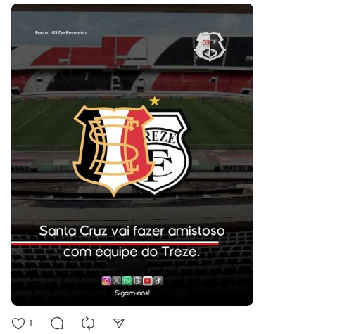O time do Treze joga contra o Santa Cruz-PE, em Recife, domingo (29), às 16h, no Arrudão. O amistoso serve de preparação para o Galo e Cobral Coral, visando as disputas do Campeonato Brasileiro de 2026.