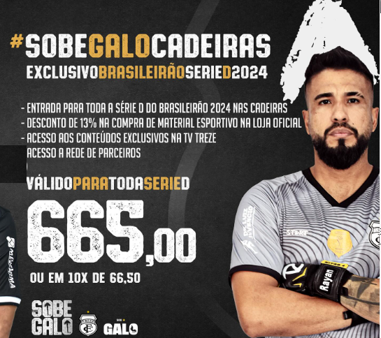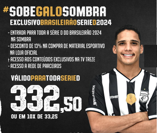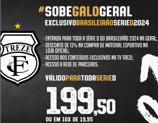 A partir daí é por conta do Treze, até o final da Série D. “Faça seu Plano, seja Sócio Torcedor e garanta sua presença ajudando o Galo a conseguir o acesso para a Série C no ano do Centenário”.