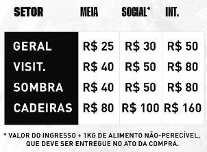 Cadeiras: R$ 80,00 meia, R$ 100,00 social e R$ 160,00 inteira.
