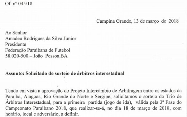 O Treze pede árbitros de fora seu primeiro jogo da semifinal do Campeonato Paraibano de 2018, marcado para domingo, dia 18, contra adversário a ser definido entre Botafogo e Sousa. O documento assinado pela diretoria do Galo da Borborema, no dia 13. Veja o ofício.