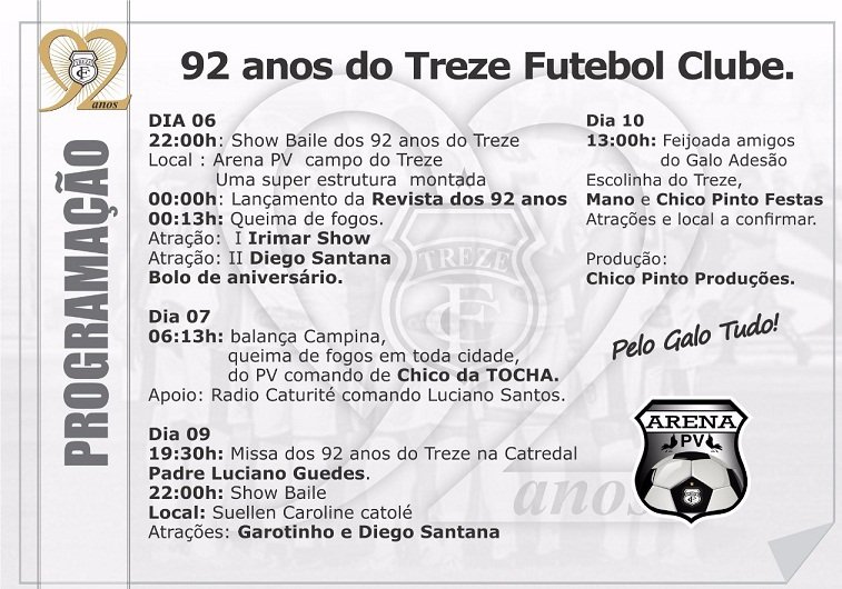 O Treze mesmo sem qualquer atividade no futebol profissional, trabalhando apenas as categorias de base no futebol, as ações sociais e patrimoniais, sua diretoria em parceria com sua torcida programa festividade para comemorar mais uma data de fundação do clube, que aconteceu neste dia 7 de setembro. O Treze completa 92 anos. Veja o elenco de atividades, tem show musical, lançamento de revista, queima de fotos, missa e feijoda.