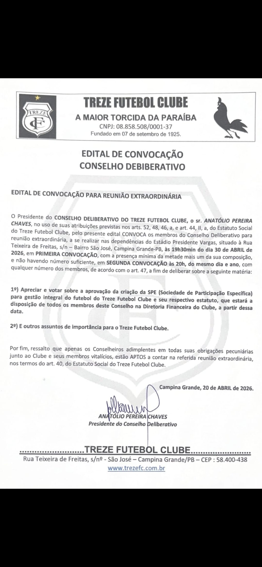 O Treze esta encaminhando esta possibilidade. Este processo que foi iniciado com as mudanças no seu Estatuto, passou por negociações com credores agora chega para avaliação em uma reunião programada para o próximo dia 30. Agora sim, o Treze pode entrar definitivamente em SAF, para formar um time.
