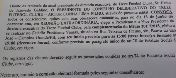 O presidente do Conselho Deliberativo do Treze, Artur Filho está convocando eleições para escolha do novo presidente executivo. A reunião será no próximo dia 13 de Junho.