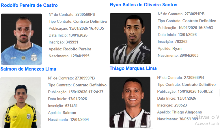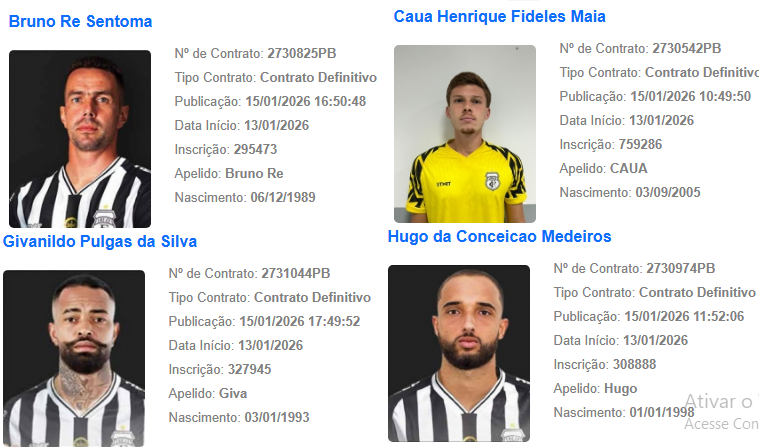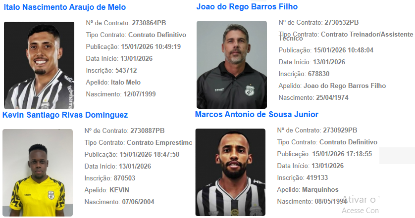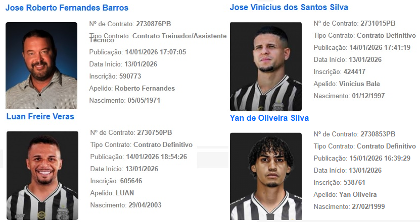 O Treze conta com 12 jogadores regularizados, além do treinador Marcelo Fernandes e seu assistente João Filho. Os nomes dos profissionais estão estampados no site da CBF, oficializado a condição de jogo para as disputas de competições oficiais com a camisa alvinegra do Galo.