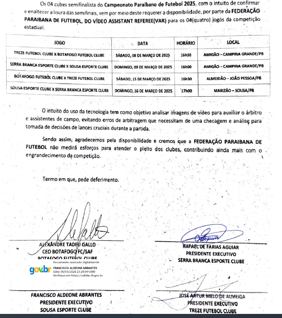 Os quatro clubes semifinalistas do Campeonato Paraibano de Futebol 2025, Treze, Serra Branca, Sousa e Botafogo-PB, com o intuito de confirmar e enaltecer a lisura das semifinais, vem por meio deste requerer a disponibilidade, por parte da Federação Paraibana de Futebol, do Vídeo Assistant Referee (VAR) para os quatro jogos da competição estadual.