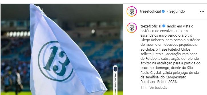 A diretoria do Treze divulgou mensagem nas suas mídias sociais contestando a escalação de Diego Roberto, para o jogo entre São Paulo-PB e Treze. A partida está programada para domingo, no estádio Carneirão, às 16h, em Cruz do Espírito Santo.