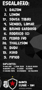 Botafogo: Dalton, Lenon, Sousa Tibiri, Wendel Lomar e Bruno Cardoso (Reniê); Rodrigo, Pedro Ivo (Bruno Leite) e Thallyson (Júlio Rusch); Dudu (Paulinho), Kiko (Jean Silva) e Pipico.