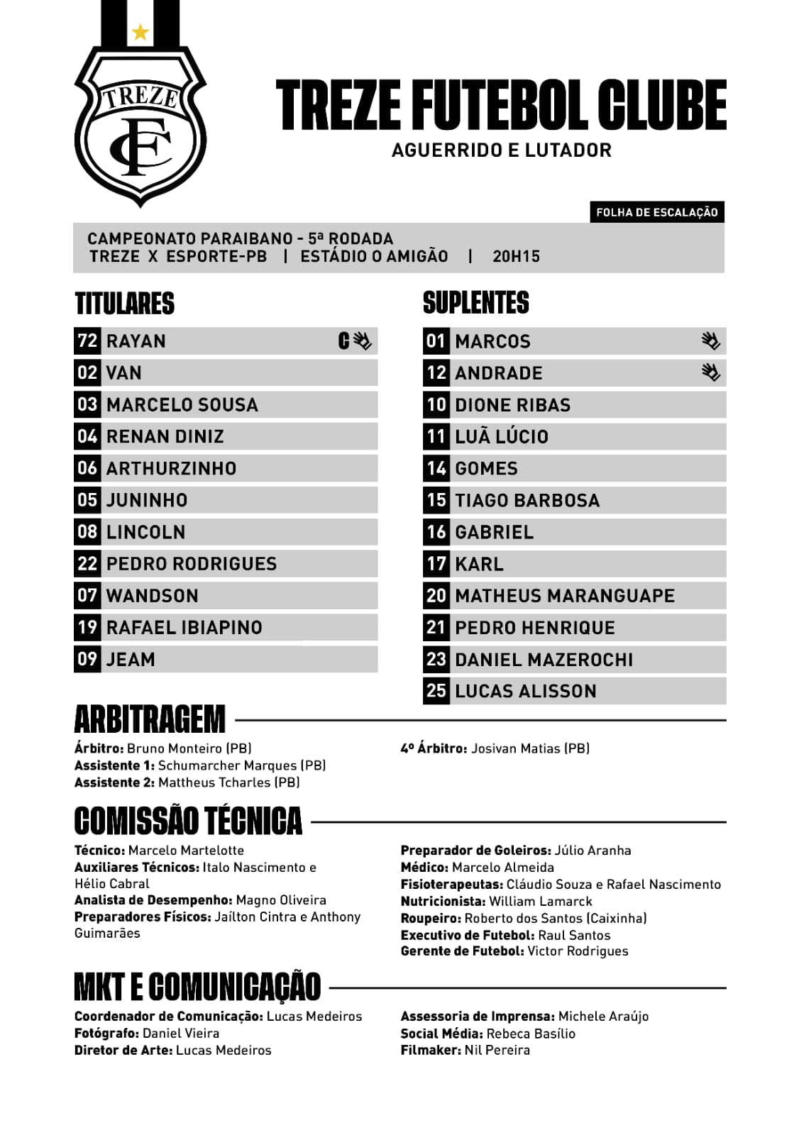 Treze – Igor Rayan; Van, Marcelo Sousa, Renan Diniz e Arthurzinho; Juninho, Lincoln (Karl) e Pedro Rodrigues (Dione); Wandson (Pedro Henrique), Jeam (Luã Lúcio) e Rafael Ibiapino (Daniel Mazerochi). Técnico: Marcelo Martelotte