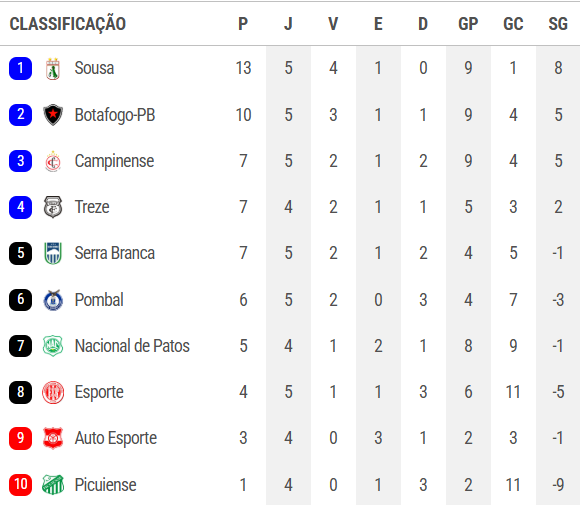 2 – Botafogo-PB 10 pontos, 3 vitórias, 5 gols de saldo