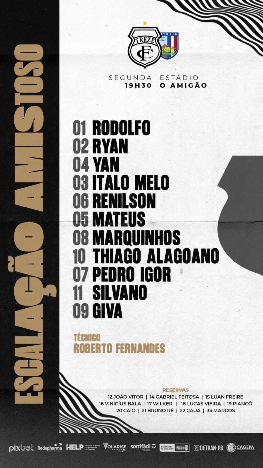 Acompanhe pela rádio WG Notícias, lance a lance do amistoso Treze 2×1 Vitória de Santo Antão-PE, às 19h30, nesta segunda-feira (29), no estádio Amigão, em Campina Grande-PB. Fim de jogo.