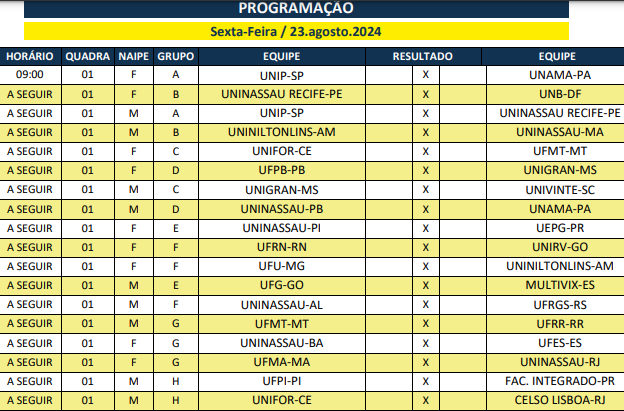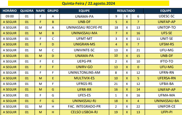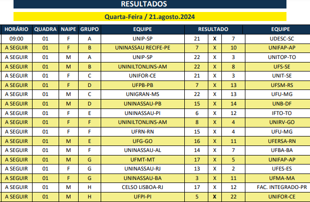 Na primeira rodada a Uninassau de João Pessoa venceu o UNB-DF por 15 a 14. Este resultado credencia o time da Paraíba e ficar com a liderança do grupo, com uma vitória simples, nesta sexta-feira diante do Unama-PA.