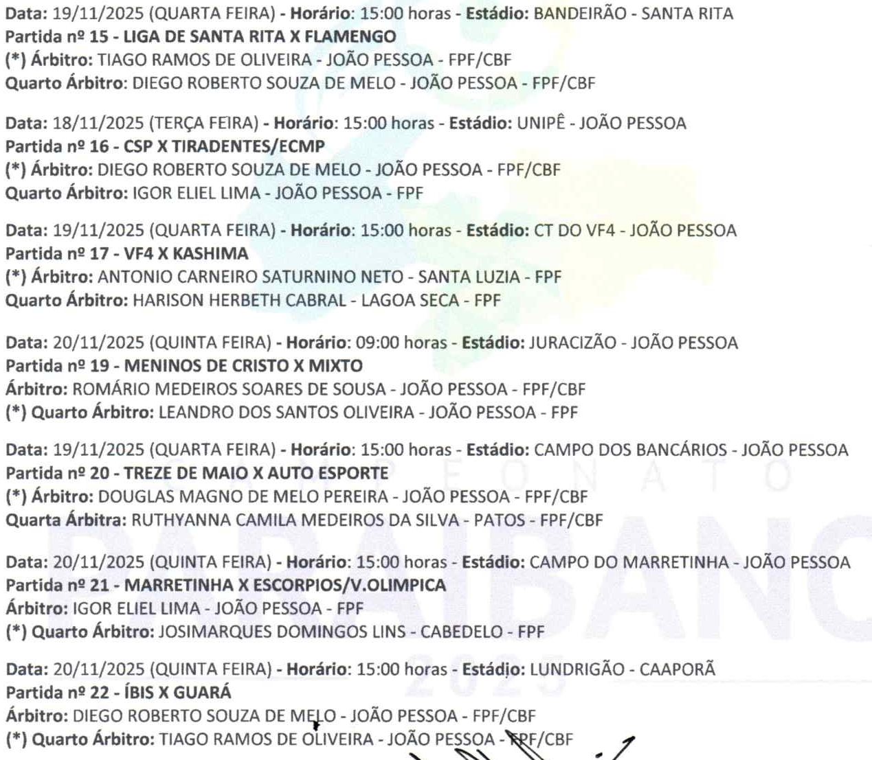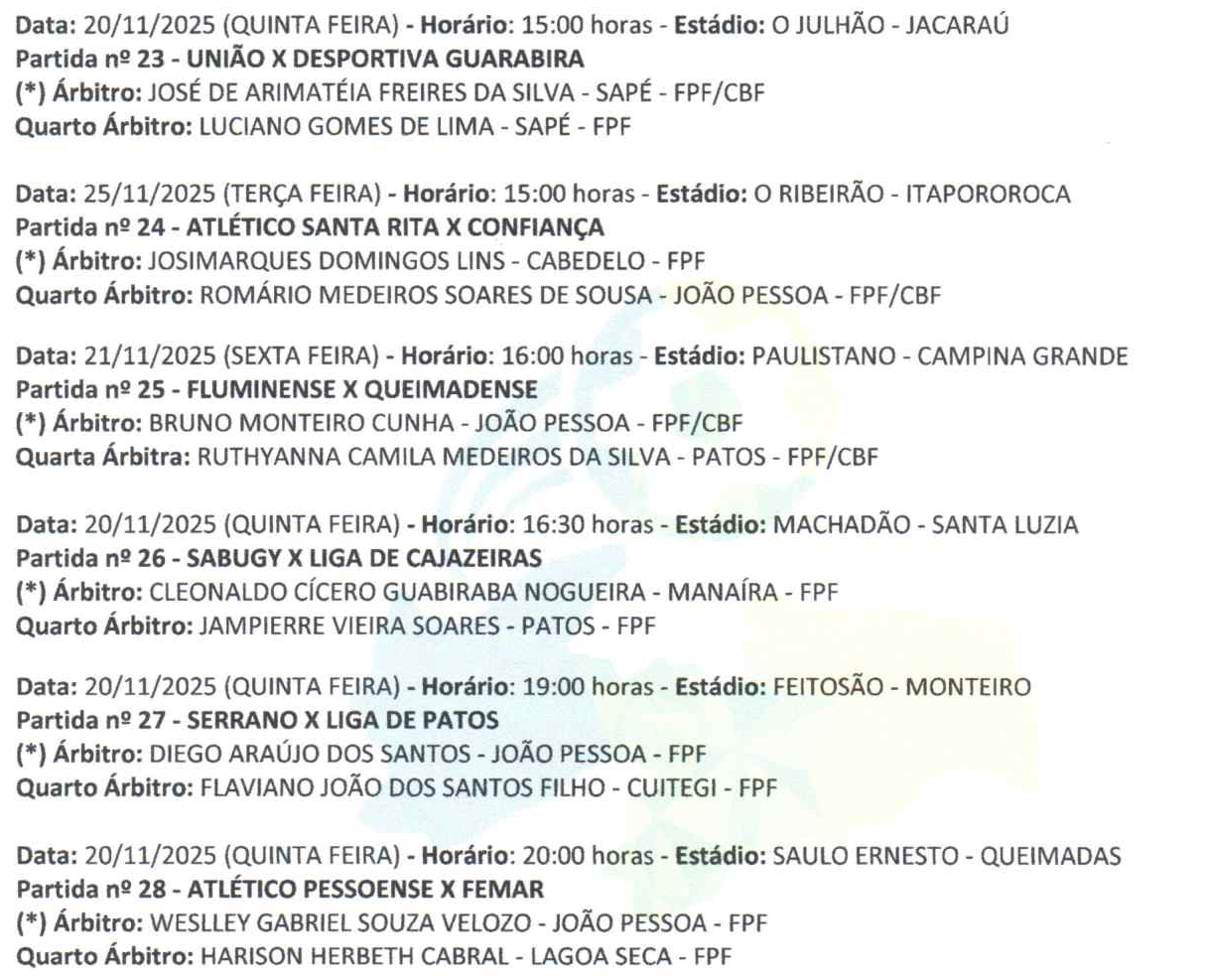 A segunda rodada do Campeonato Paraibano de Futebol Masculino Sub-13 programa 13 partidas, para os próximos dias 18, 19, 20, 21 e 25 de acordo com a tabela e escala de arbitragem.