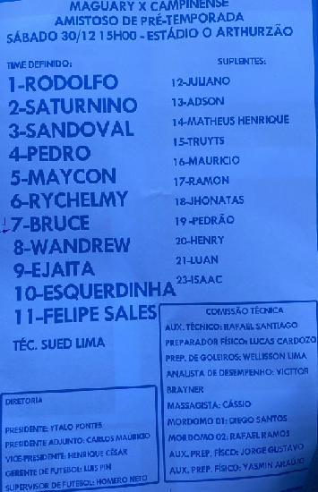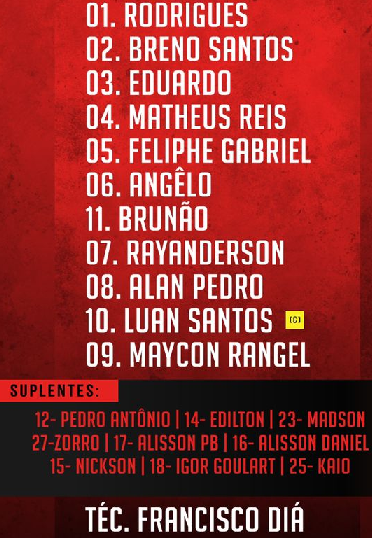 O treinador Adriano de Sousa contou com os goleiros: Arthur Diniz e Gatito; os laterais harlles Rodrigues, Mastherson Gabriel e Diego; os zagueiros: Duarte e Yuri; os volantes: Léo Garcia; Bruno Leonardo e Luis Felipe; os meias: Danielzinho, Wanderson, e Pedro Henrique; e os atacantes: Juninho, Adriel, André Ferreira e Jhon Kennedy.