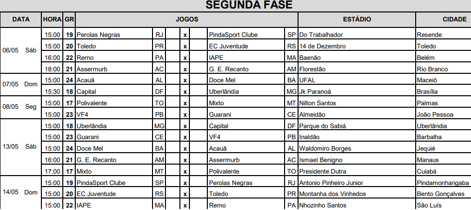 A partida de ida, de acordo com a tabela divulgada pela CBF, está programada para segunda-feira (8), às 15h, no estádio Almeidão, em João Pessoa. O VF4 superou o Mixto, também da Paraíba, com uma vitória de 2 a 1 e um empate de 1 a 1, na primeira fase.