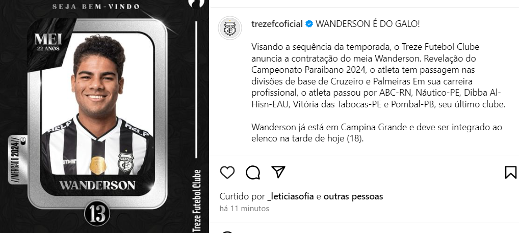 Antes de Wanderson, a diretoria do Treze contratou os seguintes reforços: Felipe Pacajus e Van (laterais-direitos), o atacante Thiaguinho e o Gui Campana. Agora são cinco novos jogadores completando o elenco do Galo da Borborema na temporada de 2024.